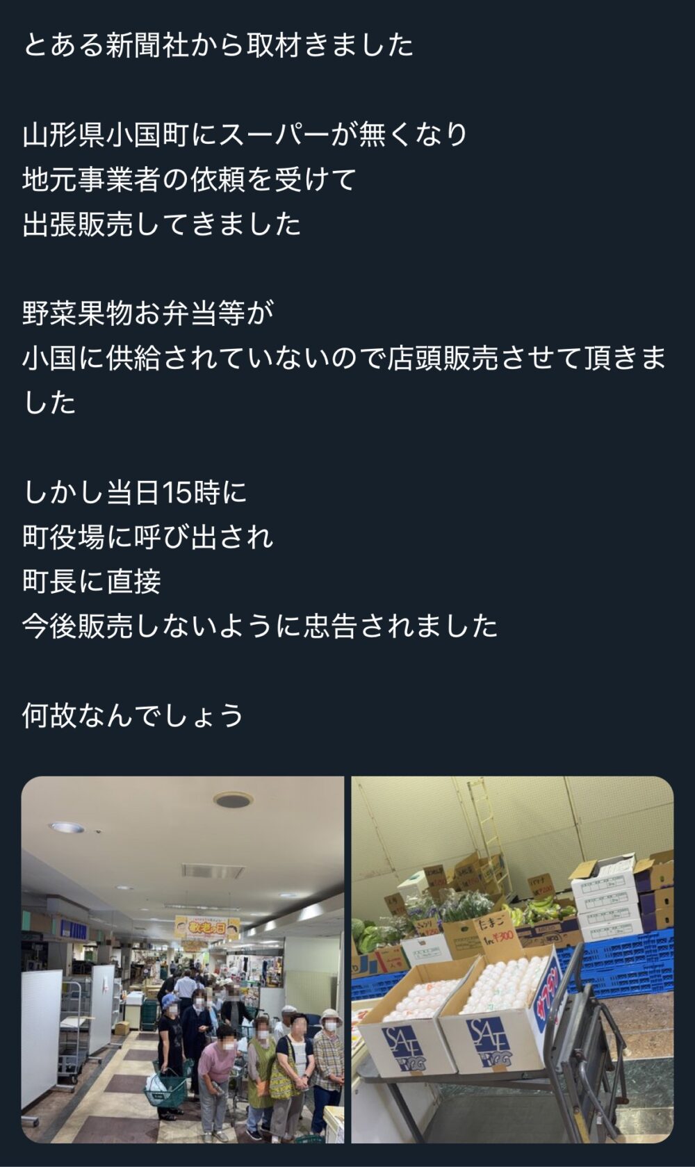 山形県小国町で唯一のスーパー「金十(かねじゅう)商店」が休業したため、新潟のスーパー「YZ(ワイシ?ー)マート」が出張販売したところ、町長から今後販売しないように忠告されたと、YZマートがXで投稿し、話題になっている。