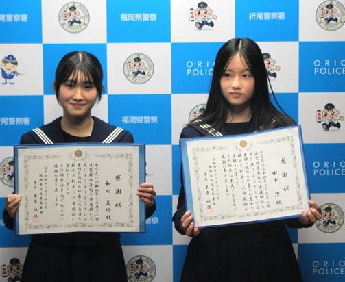 歩道橋から飛び降りる寸前だった男性を思いとどまらせたとして、福岡県警折尾署は22日、遠賀中2年の田中凛さん(13)と和田美玲さん(14)に人命救助の感謝状を贈った。