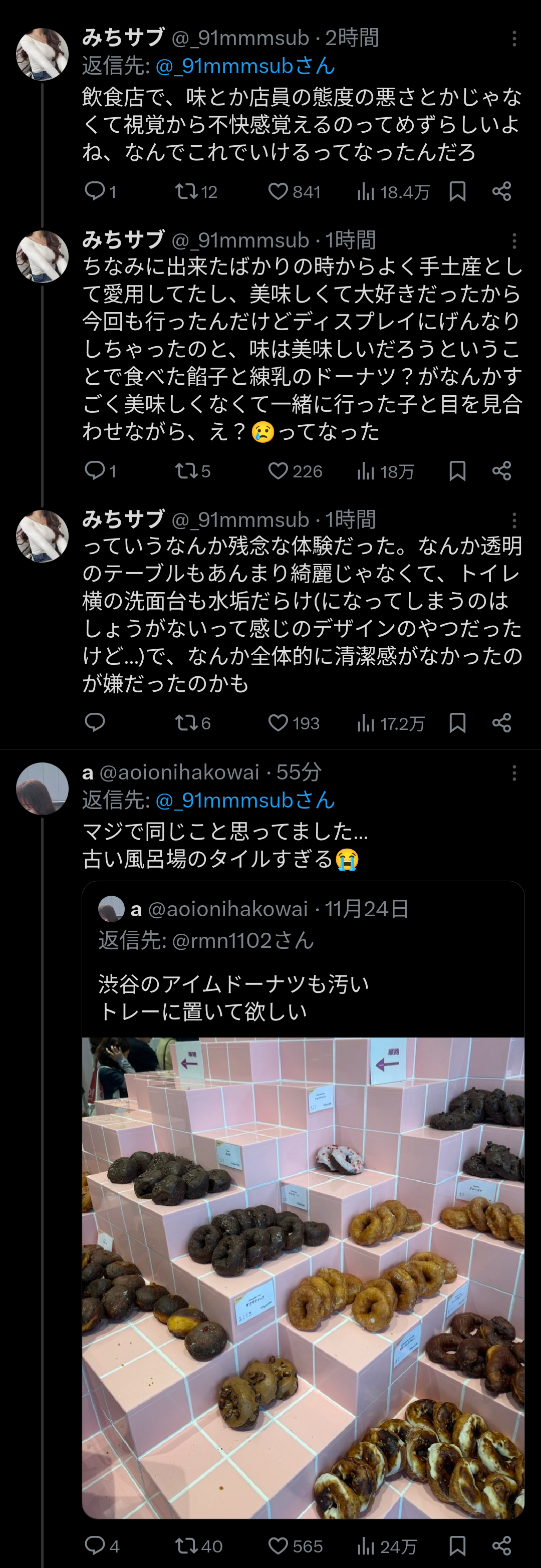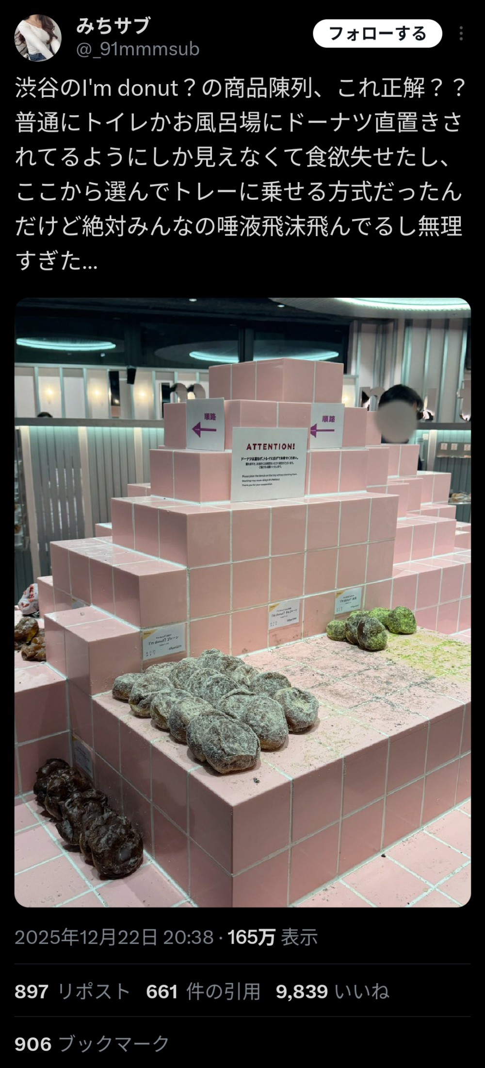 普通にトイレかお風呂場にドーナツ直置きされてるようにしか見えなくて食欲失せたし、ここから選んでトレーに乗せる方式だったんだけど絶対みんなの唾液飛沫飛んでるし無理すぎた… pic.twitter.com/uZlAgzcZLR— みちサブ (@_91mmmsub) December 22, 2025