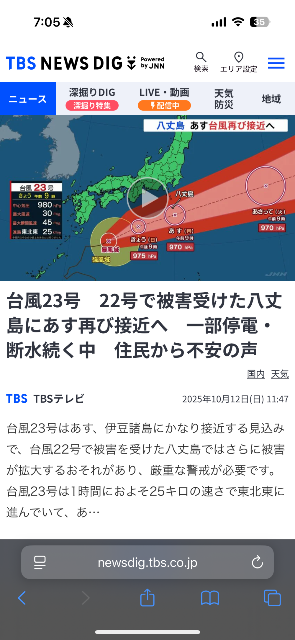 台風23号は1時間におよそ25キロの速さで東北東に進んでいて、あ…