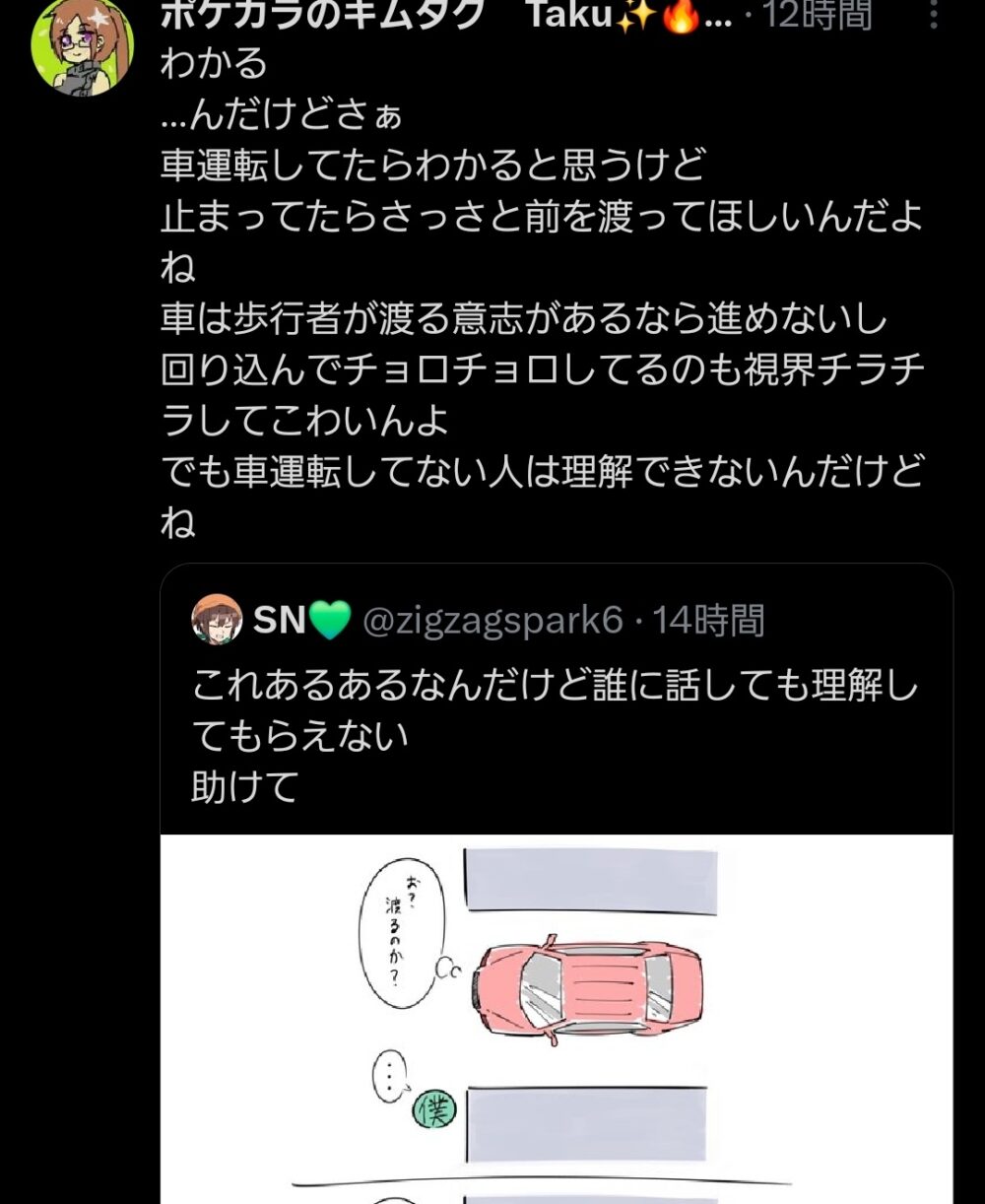 前歩いてんのに突然動き出す車もいるだろうし老害とか女の運転なら尚更