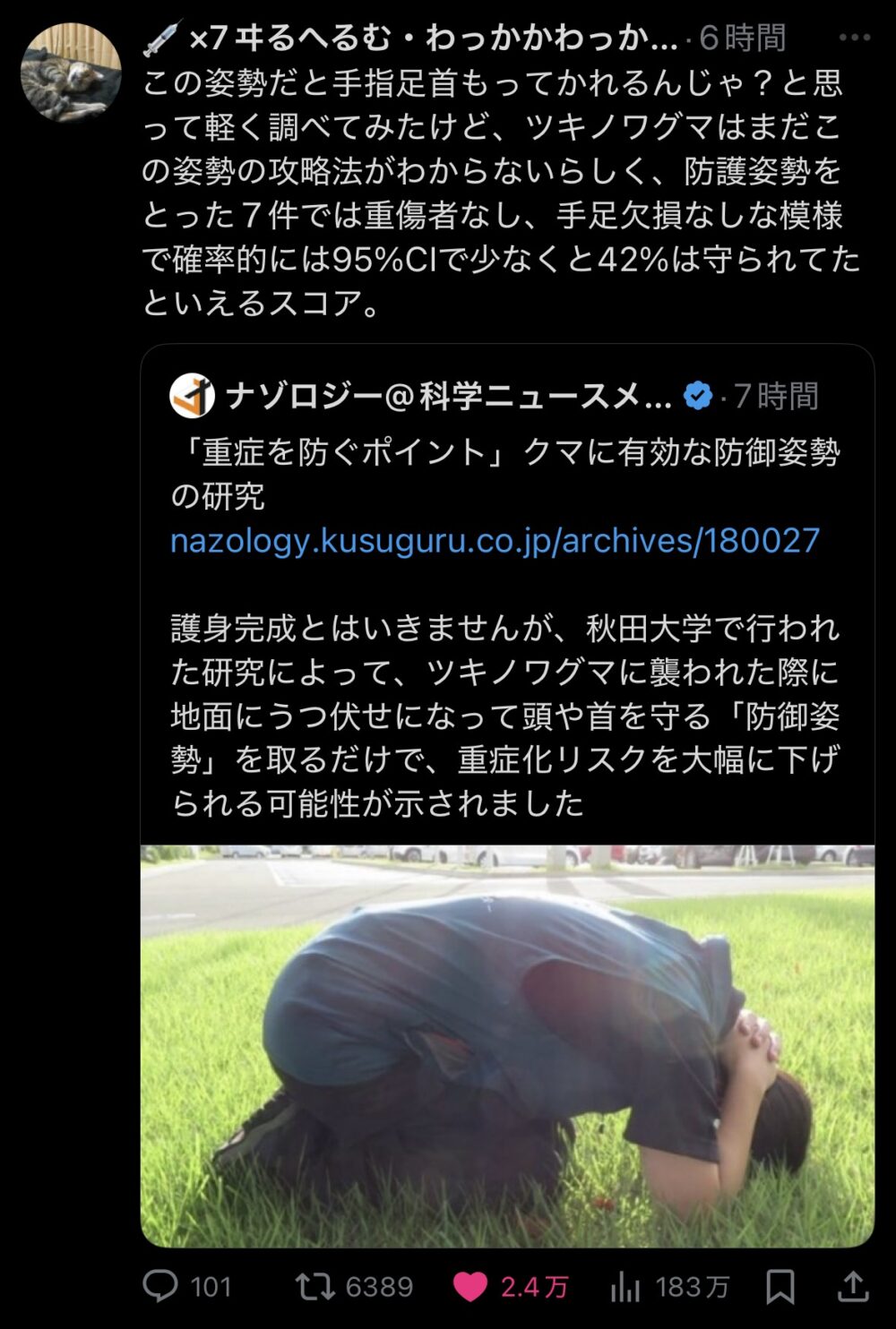この姿勢だと手指足首もってかれるんじゃ?と思って軽く調べてみたけど、ツキノワグマはまだこの姿勢の攻略法がわからないらしく、防護姿勢をとった7件では重傷者なし、手足欠損なしな模様で確率的には95%CIで少なくと42%は守られてたといえるスコア。