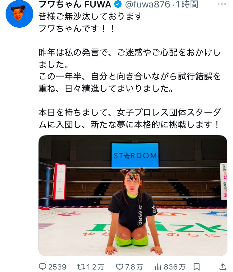 この一年半、自分と向き合いながら試行錯誤を重ね、日々精進してまいりました。本日を持ちまして、女子プロレス団体スターダムに入団し、新たな夢に本格的に挑戦します! pic.twitter.com/ROQSKBQwt6