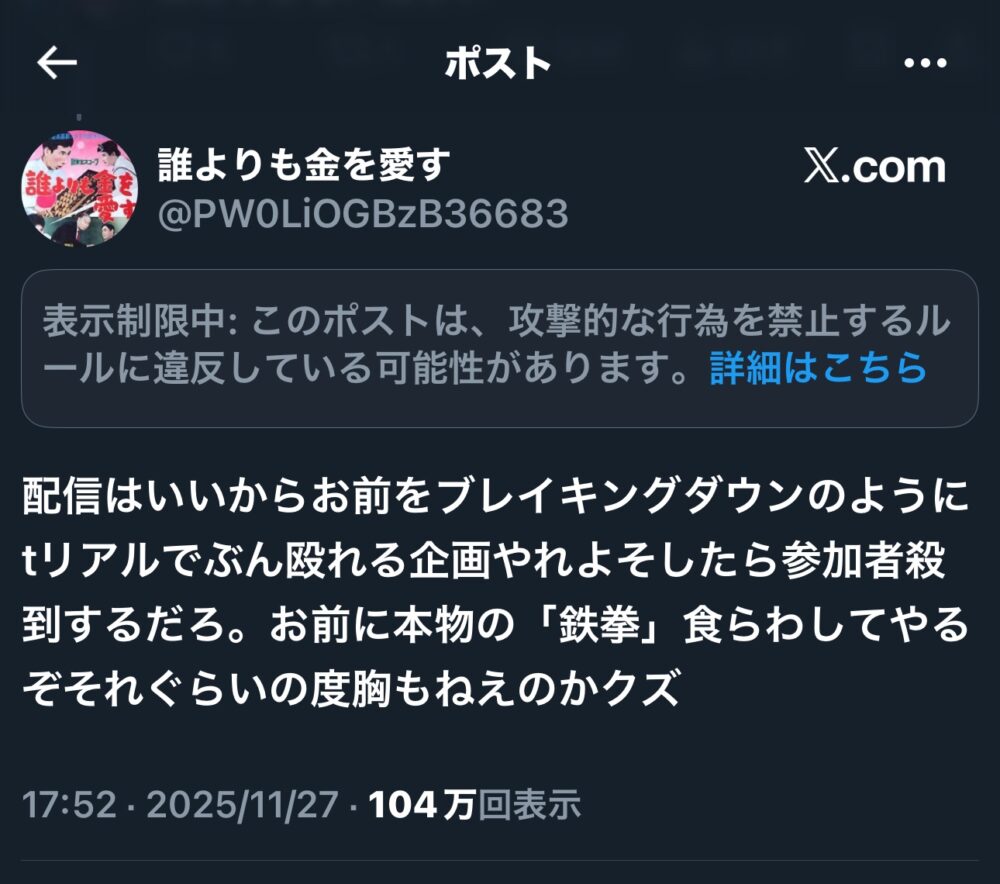104万回インプレ付いてて草。ガチなのか冗談なのか分からんが、勝手に恋してキレてるのは非モテすぎやん。