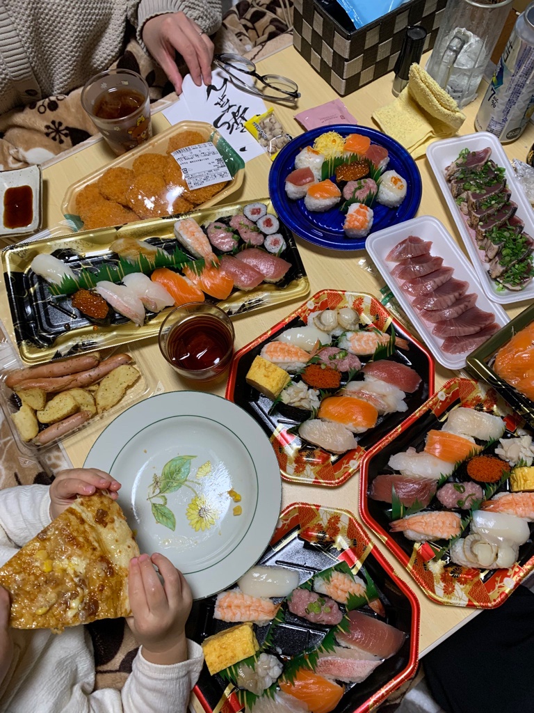 ピザと寿司と刺し身とコロッケをいっしょに食べるなよ…