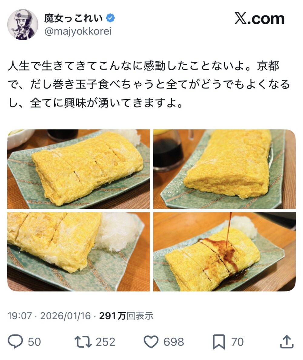 人生で生きてきてこんなに感動したことないよ。京都で、だし巻き玉子食べちゃうと全てがどうでもよくなるし、全てに興味が湧いてきますよ。 pic.twitter.com/h7ANCaSCdb