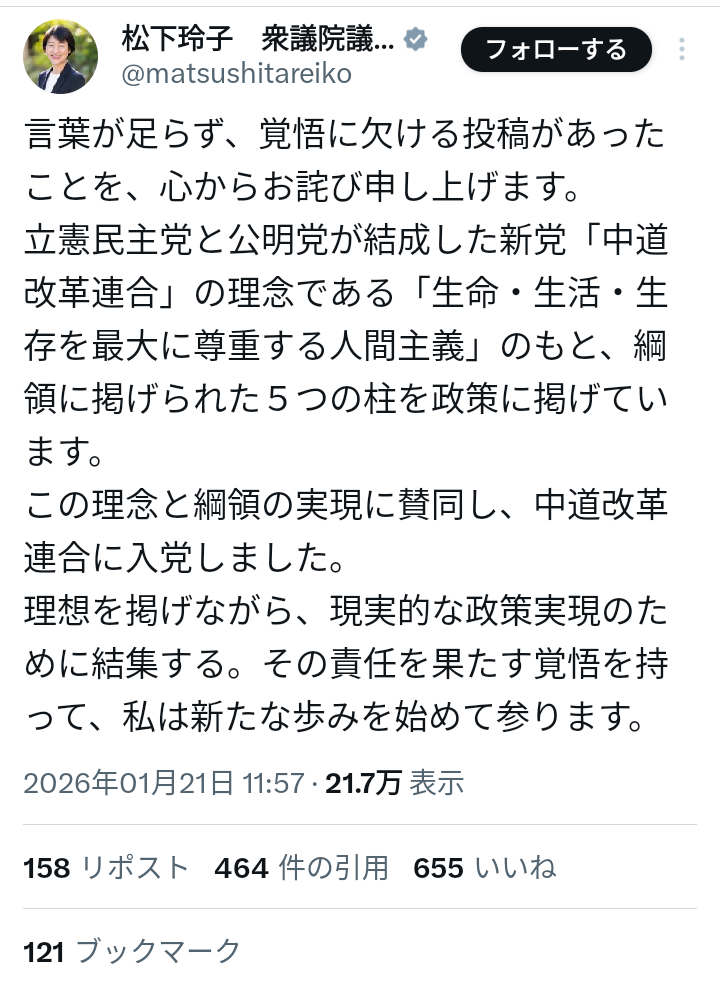 立憲民主党と公明党が結成した新党「中道改革連合」の理念である「生命・生活・生存を最大に尊重する人間主義」のもと、綱領に掲げられた5つの柱を政策に掲げています。…— 松下玲子 衆議院議員 中道改革連合 東京18区(武蔵野・小金井・西東京市) (@matsushitareiko) January 21, 2026