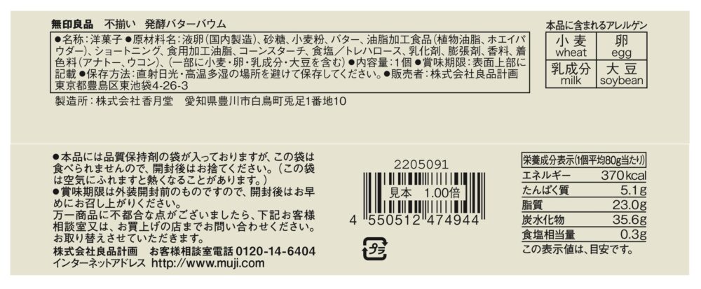 【画像】俺「無印の不揃いバウムうめっ・・・!うめっ・・・!(5個ペロリ)」→何となく栄養成分を見る