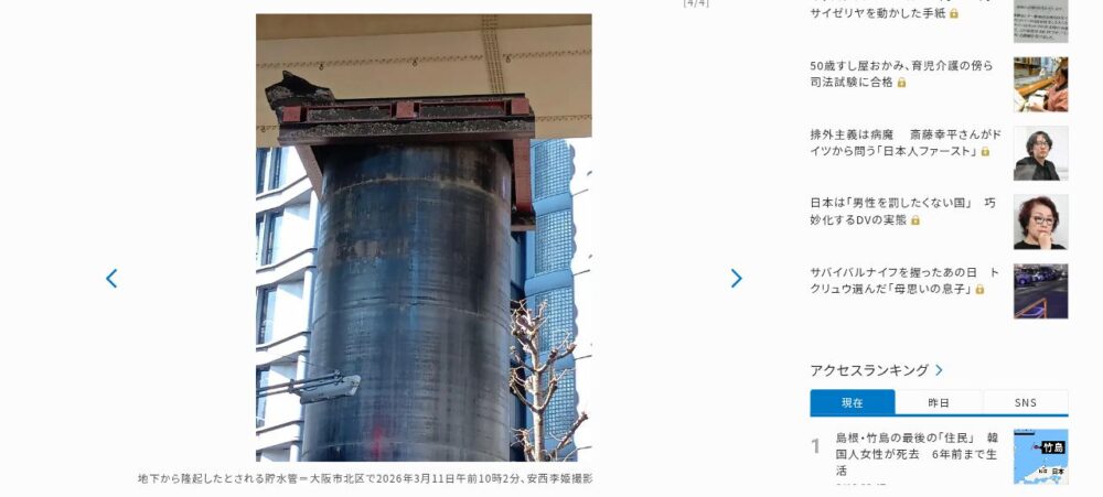 大阪府警によると、11日朝、大阪市北区の路上で、地下に敷設されていた貯水管が地上に隆起しているのが確認された。現場は工事中で、地上十数メートルの高さにせり上がっているという。けが人は確認されていない。