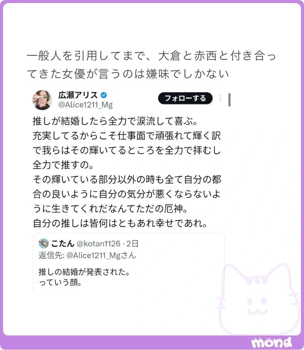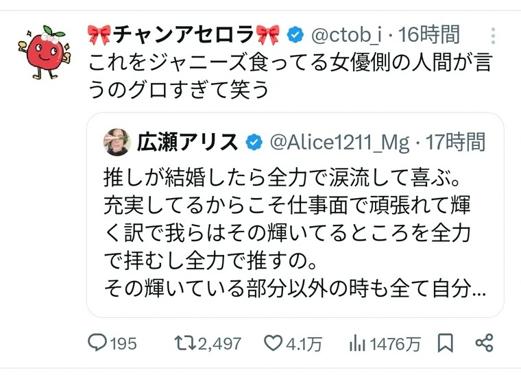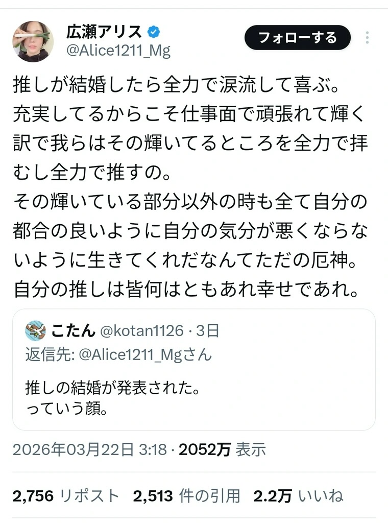 アリス「推しが結婚したら喜ぶ」「推しに自分の都合のいいように生きてくれなんて疫神」