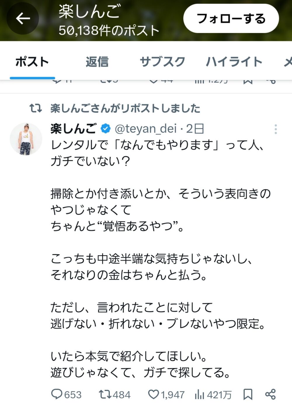 逃げない・折れない・ブレないやつ限定。…— 楽しんご (@teyan_dei) April 7, 2026