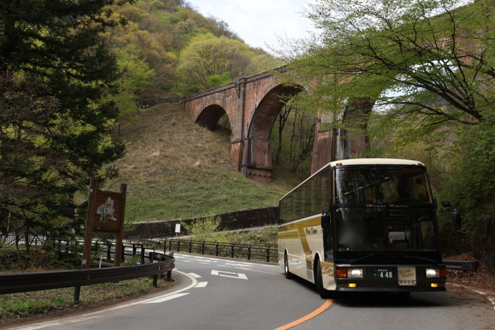 物理的限界: 写真の場所(碓氷峠の旧道・めがね橋付近)のような極端に狭いヘアピンカーブでは、大型バスの構造上の最小回転半径が車線幅を上回るため、はみ出し走行は「回避不能な行為」とみなされます。