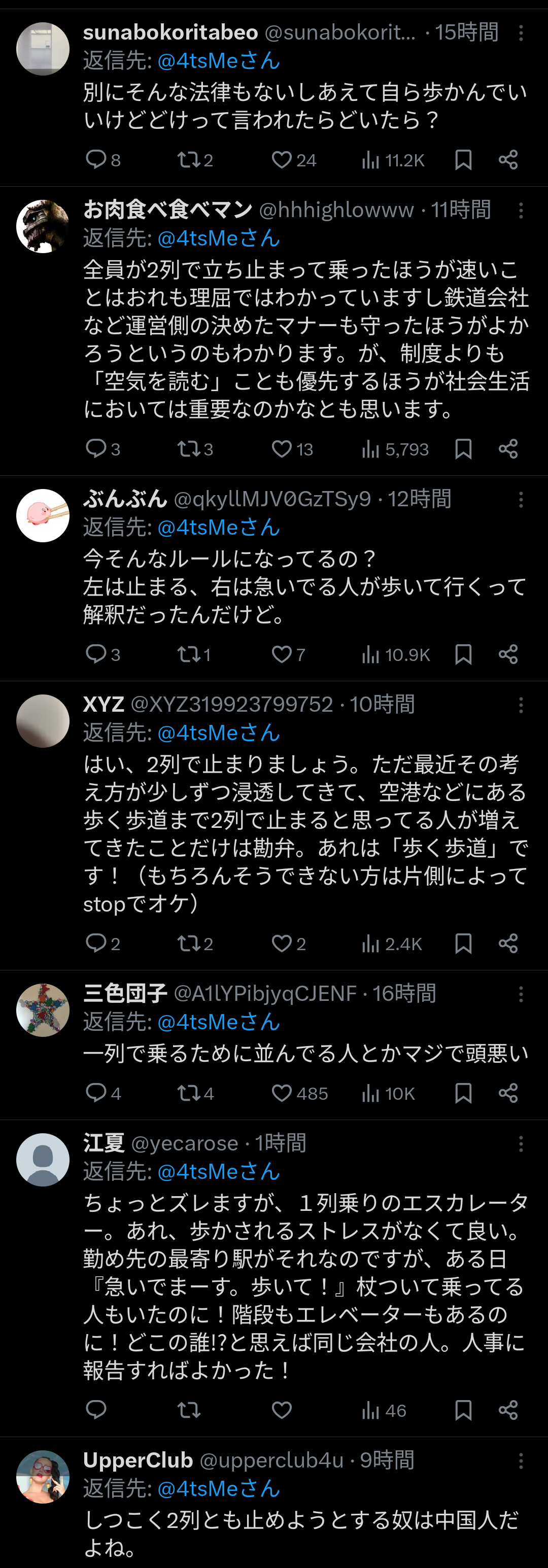 左に乗る列ができてて右側で止まって乗ってる人の前がガラガラの状態で乗れてる奴はすごいと思う結構目立つ